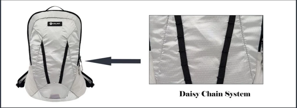 USLINT has developed numerous lightweight backpacking packs equipped with daisy chain systems. For example, our latest lightweight backpacking pack has two daisy chains on the front pocket, allowing users to customize them to their needs. If you would like custom hiking packs, custom trekking packs, or custom sports packs with daisy chain systems for your brand, please feel free to contact us. USLINT is an outdoor and sports pack manufacturer with over 20 years of experience, offering OEM/ODM services. We can provide customized pack solutions to meet your specific requirements.