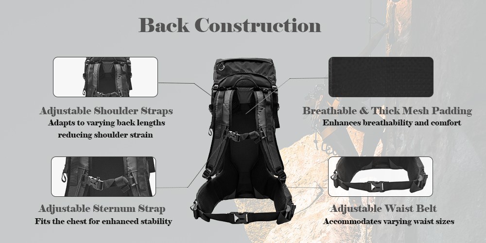 The ergonomic back design and padded mesh padding ensure comfortable carrying during hiking. Adjustable shoulder straps, waist belt, and chest strap further enhance stability, preventing movement and improving safety. The adjustable webbing at the rear can be used to secure a sleeping bag or trekking poles, making your hike even more comfortable.